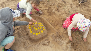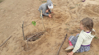 Varakevadel, mil veel jahe ja niiske, on parimad liivaga mängimise ilmad. Klassikaliselt ilus ja palav rannailm tähendab peenikest ja pudedat liiva, mis ilma veeta nii hästi ehitamiseks ei kõlba. Seega - mida n-ö koledam ja mittekevadisem ilm, seda parem võimalus liivaehituseks. Alustasime lastega tule teemat ning samal päeval hakati muidugi okstest "lõkkeaset" ehitama, ikka nii et liivavall turvalisuseks ümber. Sealt arenes juba edasi mäng, et ollakse matkal ning on vaja lõkkel toitu teha, selleks omakorda oli tarvis leida söögitegemiseks sobivad, otsast harulised tokid, toiduks kala püüda jms matkavärki.