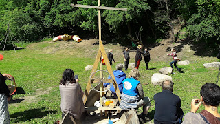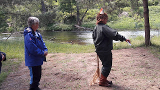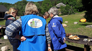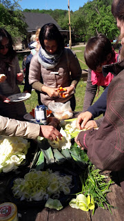 Üle pika aja oli nii tore osaleda koolitusel, kus lõunasöögi valmistasime endale ühiselt ise. Parim viis inimesi omavahel tuttavaks teha ongi ju neid ühiselt tegutsema panna. Nõnda valmisid õuelaual hakkides ja tükeldades maitsvad ja tervislikud toidud, mida keetisme suures pajas lõkke kohal, samuti küpsetasime lõkkeleiba. Korjasime veel maitsestamiseks sobivaid taimi juurde, nii et ühepajatoidu sisse ja salatiks kõrvale sai veel noori kuusevõrseid, raudrohi lehti, hapuoblikat. Tore oli ka, et juba koolituse alguses kingiti kõikidele (Mulle logoga) korduvkasutatav tass ning öeldi kohe, et see olgu alati kaasas, muidu ei ole kuskilt seest juua. Viimastel sarnastel koolitustel, on mind ikka häirima jäänud ühekordne plasttopsindus, mis ka ühepäevase ürituse puhul märkimisväärselt suureks koguneb.